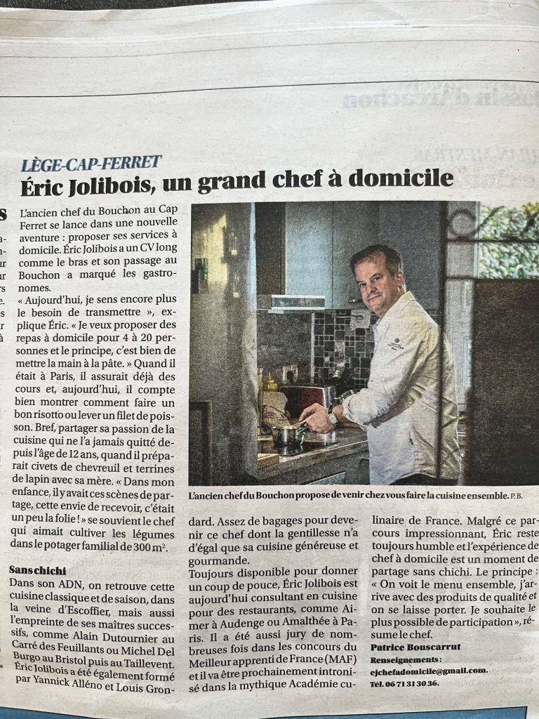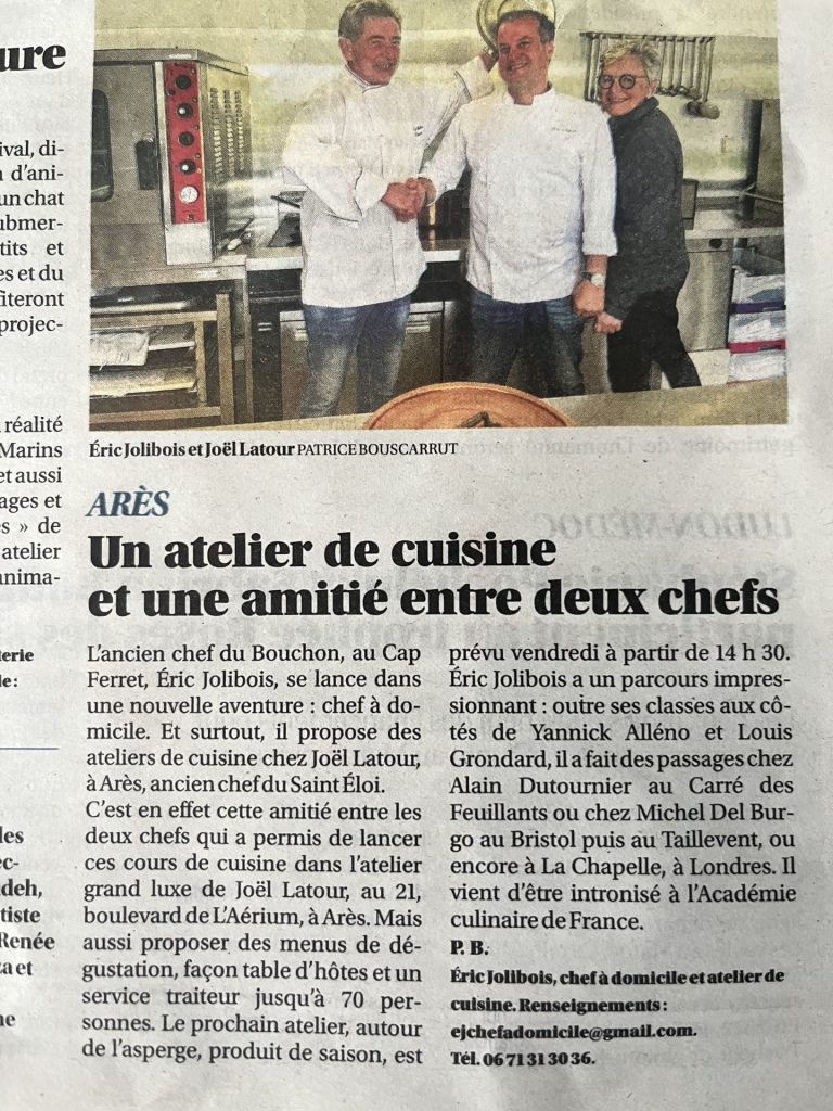 Depuis Arès, le Chef étoilé Eric Jolibois vous propose des prestations culinaires uniques : à votre domicile, en atelier ou à sa table d’hôte, chaque repas est une expérience authentique, inspirée par une carrière auprès des plus grands noms de la gastronomie.